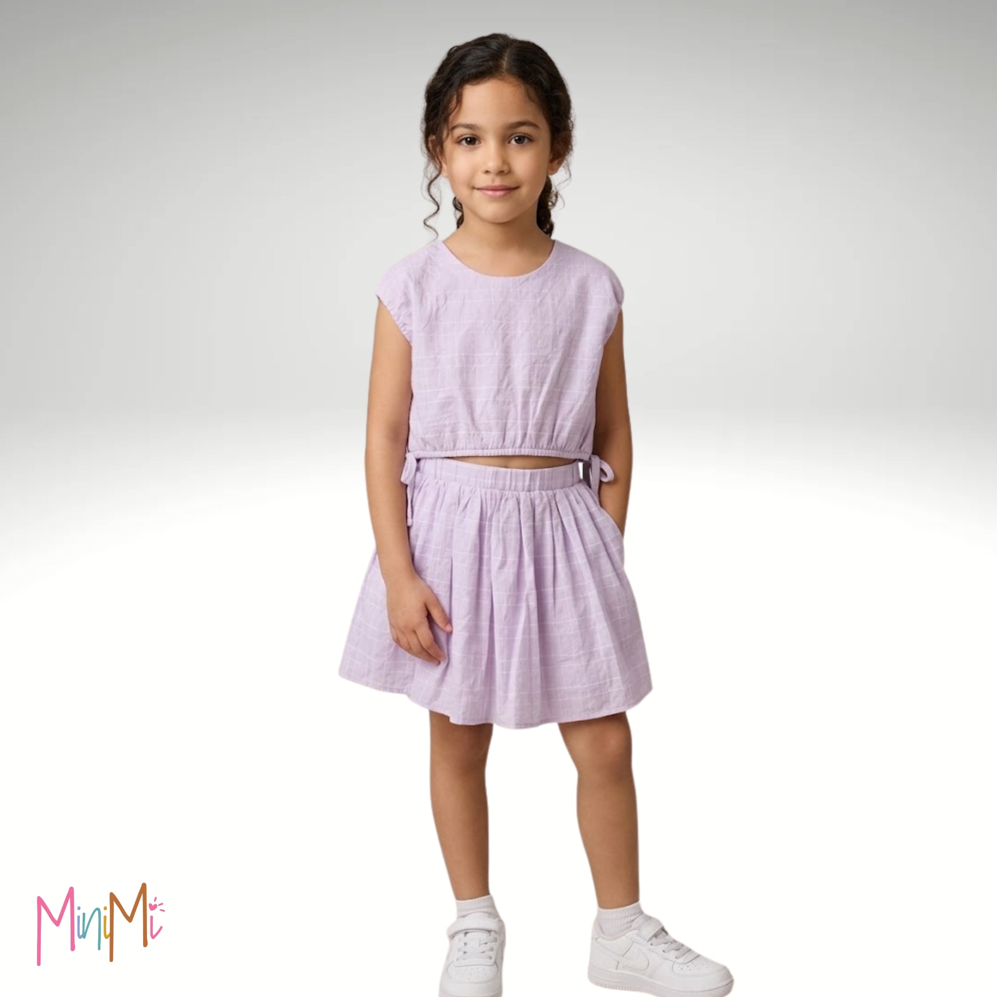 Este conjunto de blusa tipo crop con falda de color lila, nuestras chicas no lo pensaran 2 veces en ponérselo. Tela fresca y suave perfecta para nuestro clima. La blusa tiene el corte perfecto para que no sea tan corta ni tan larga. Déjalas que usen ambas piezas juntas o que se aventuren a hacer Mix & Match en su closet!!!