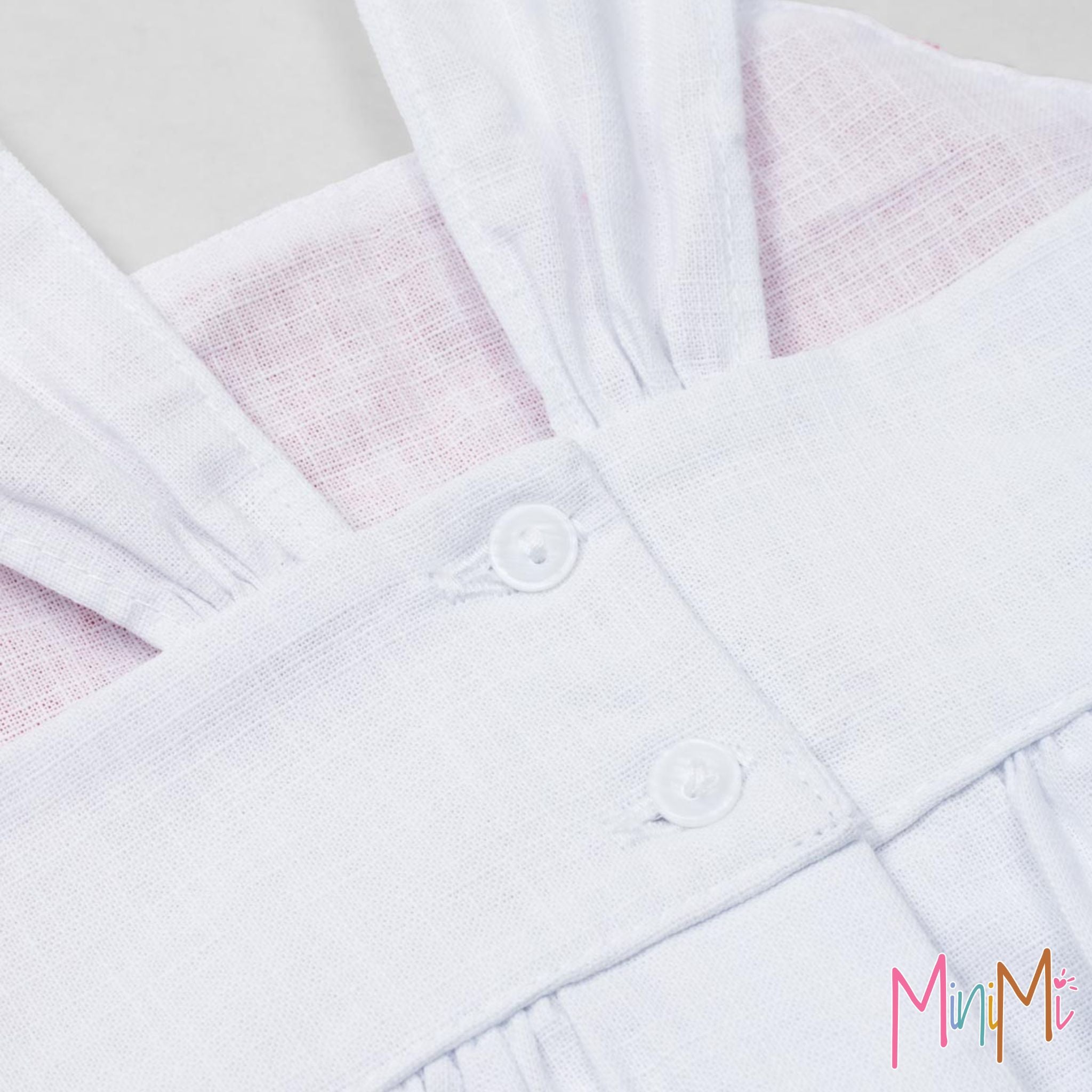 Traje con textura tejida rosa y falda amplia en lino blanco, pensado para que tu bebé se vea adorable y se sienta cómoda todo el día. El diseño integrado del onesie facilita cada cambio. Un outfit práctico, ligero y perfecto para sus primeros planes bajo el sol. 🌸