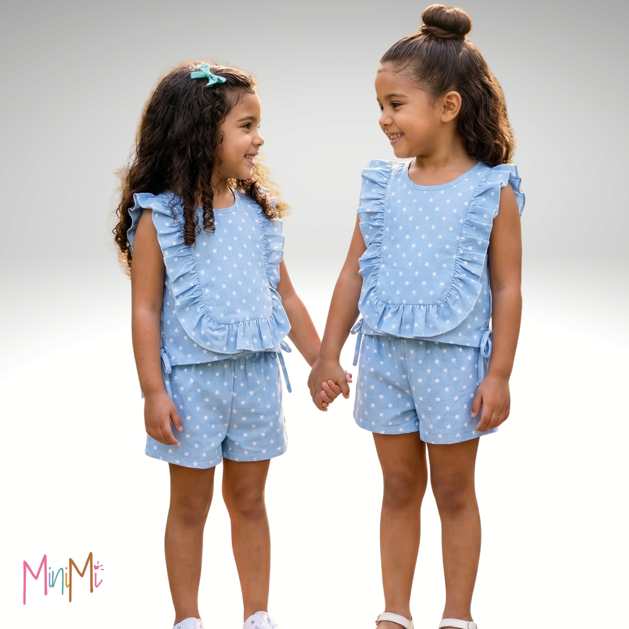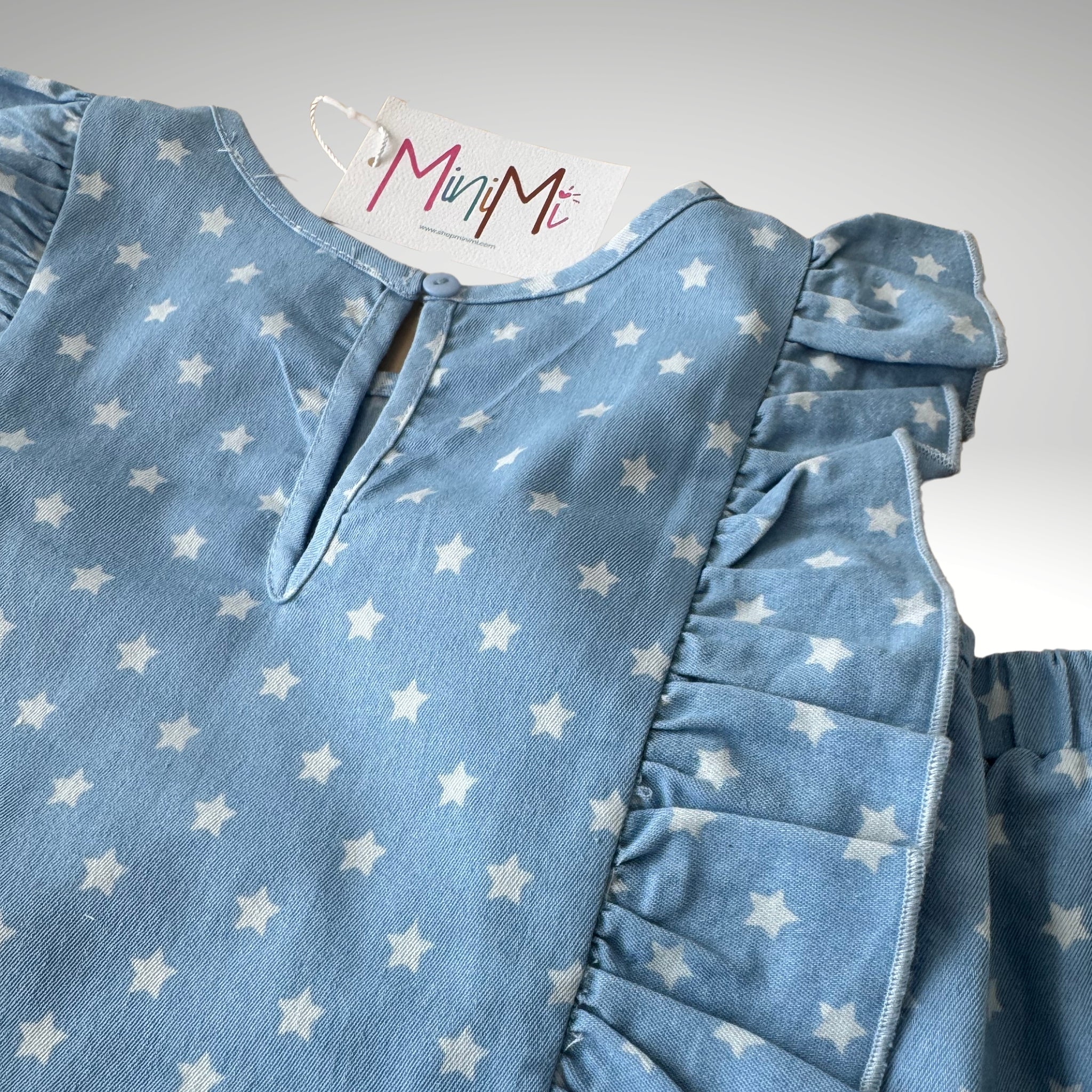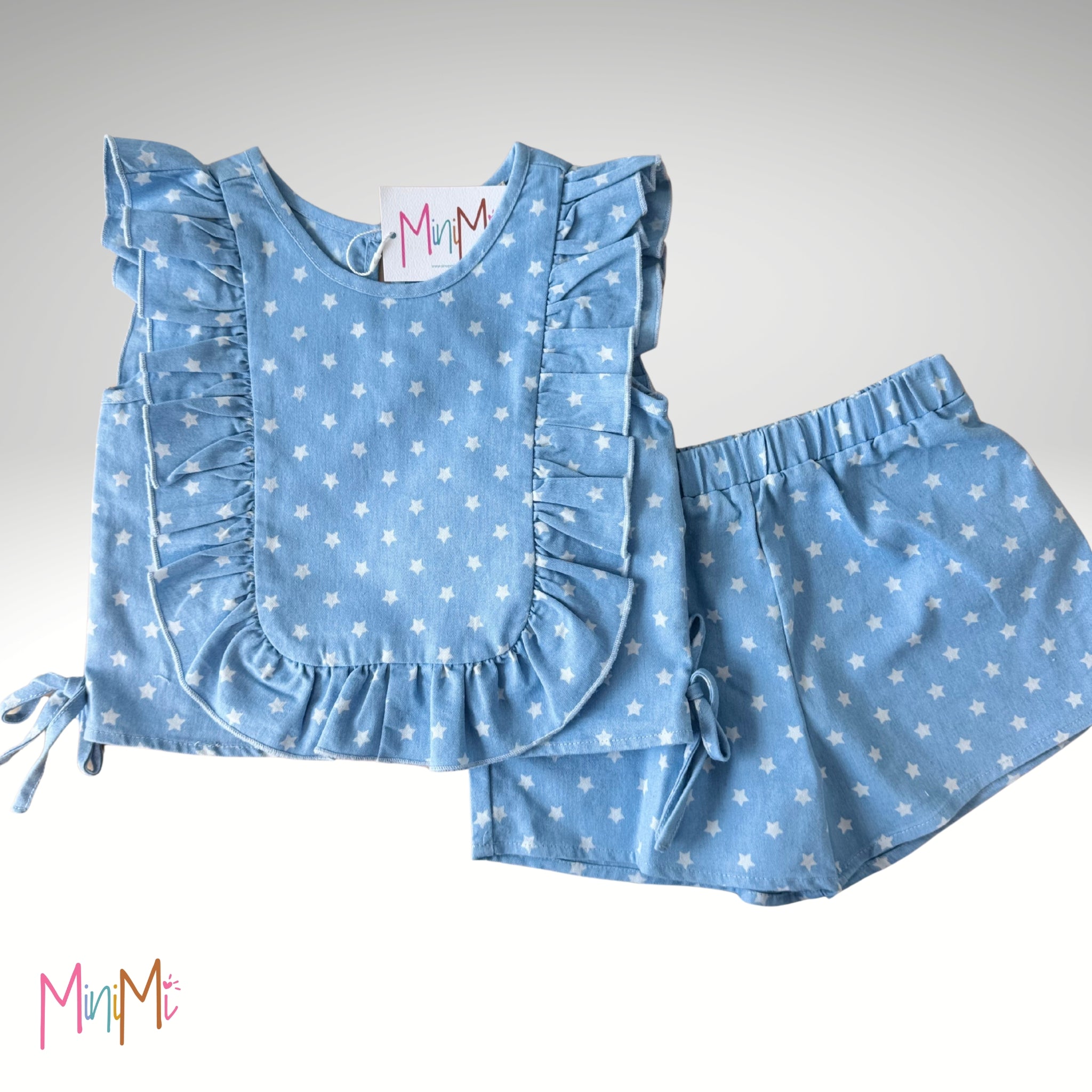 Este conjunto de blusa y pantalón es perfecto para cualquier salida o actividad para que tus MiniMis este super lindas. Los detalles de los volantes en toda la blusa y los lacitos en los lados hacen que sea una pieza que todos tendrán que decirle lo lindas que están. La tela es tipo mahón pero bastante suave.